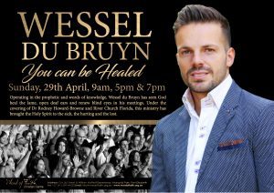 Operating in the prophetic and words of knowledge, Wessel du Bruyn has seen God heal the lame, open deaf ears and renew blind eyes in his meetings. Under the covering of Dr Rodney Howard-Browne and River Church Florida, this ministry has brought the Holy Spirit to the sick, the hurting and the lost.